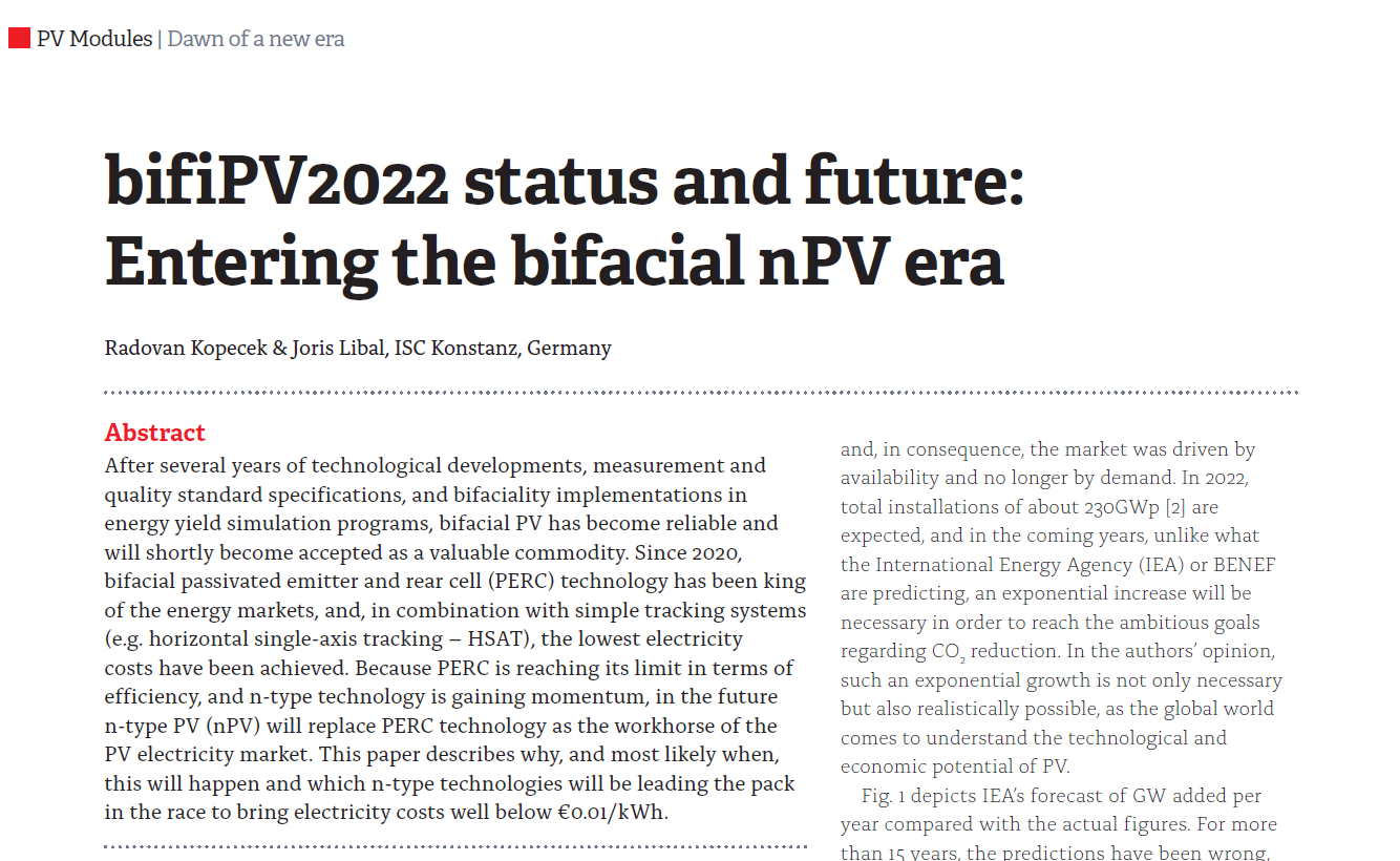 After several years of technological developments, measurement and quality standard specifications, and bifaciality implementations in energy yield simulation programs, bifacial PV has become reliable and will shortly become accepted as a valuable commodity. Since 2020, bifacial passivated emitter and rear cell (PERC) technology has been king of the energy markets, and, in combination with simple tracking systems (e.g. horizontal single-axis tracking – HSAT), the lowest electricity costs have been achieved. Because PERC is reaching its limit in terms of efficiency, and n-type technology is gaining momentum, in the future n-type PV (nPV) will replace PERC technology as the workhorse of the PV electricity market. This paper describes why, and most likely when, this will happen and which n-type technologies will be leading the pack in the race to bring electricity costs well below €0.01/kWh.