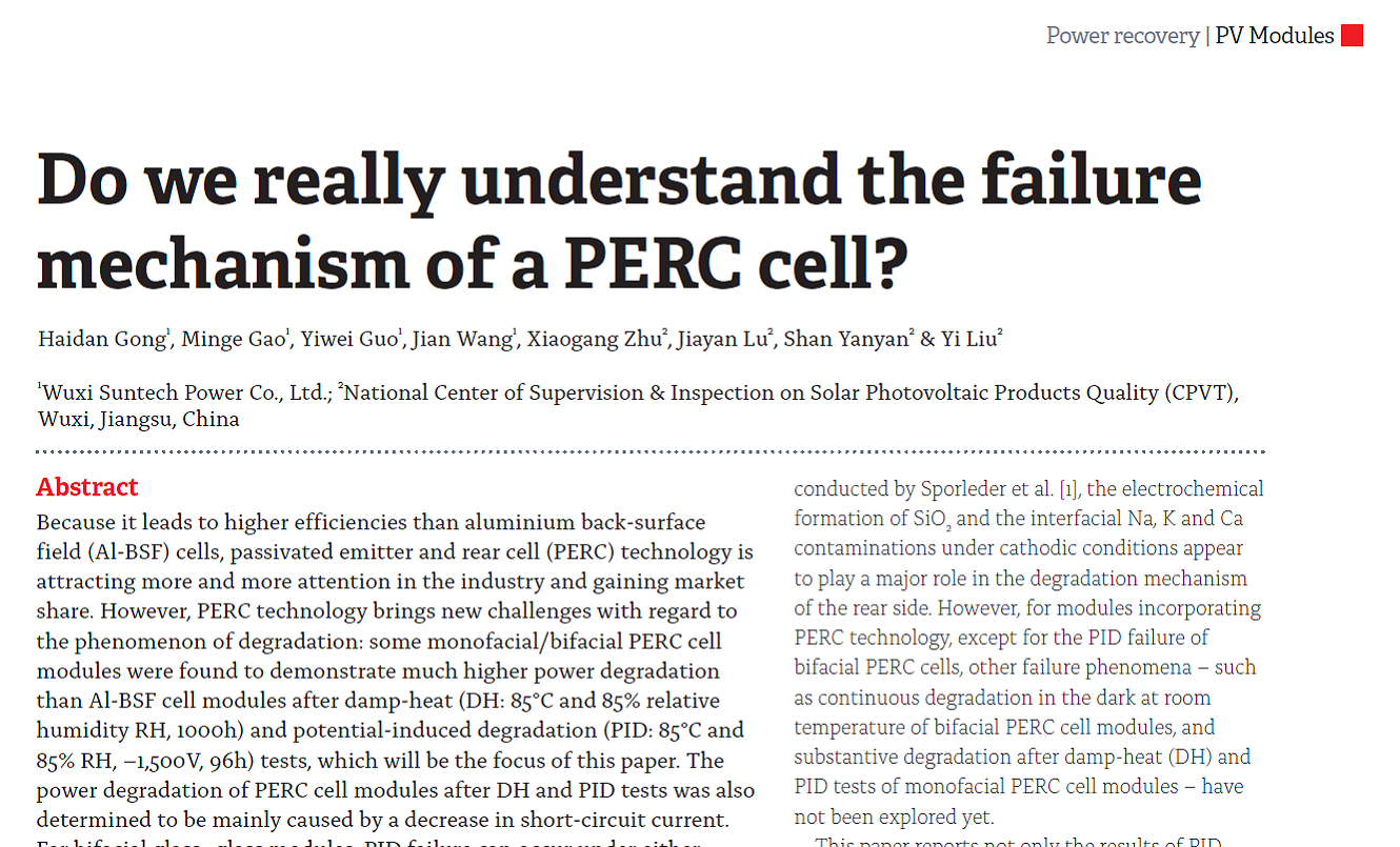 Because it leads to higher efficiencies than aluminium back-surface field (Al-BSF) cells, passivated emitter and rear cell (PERC) technology is attracting more and more attention in the industry and gaining market share. However, PERC technology brings new challenges with regard to the phenomenon of degradation: some monofacial/bifacial PERC cell modules were found to demonstrate much higher power degradation than Al-BSF cell modules after damp-heat (DH: 85°C and 85% relative humidity RH, 1000h) and potential-induced degradation (PID: 85°C and 85% RH, –1,500V, 96h) tests, which will be the focus of this paper.