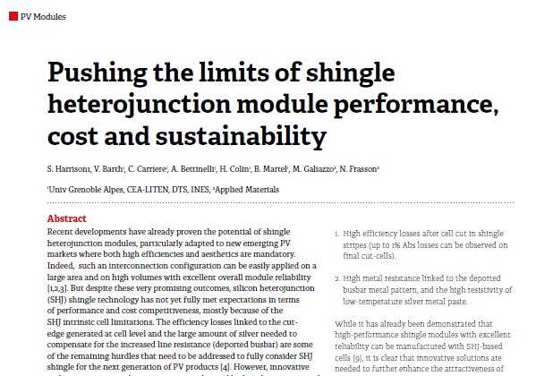 Technological improvements contribute to enhancing the already high attractiveness of SHJ shingle technology, and to close the gap with industrial, economic and sustainability requirements usually considered for large-scale deployment of such panels.