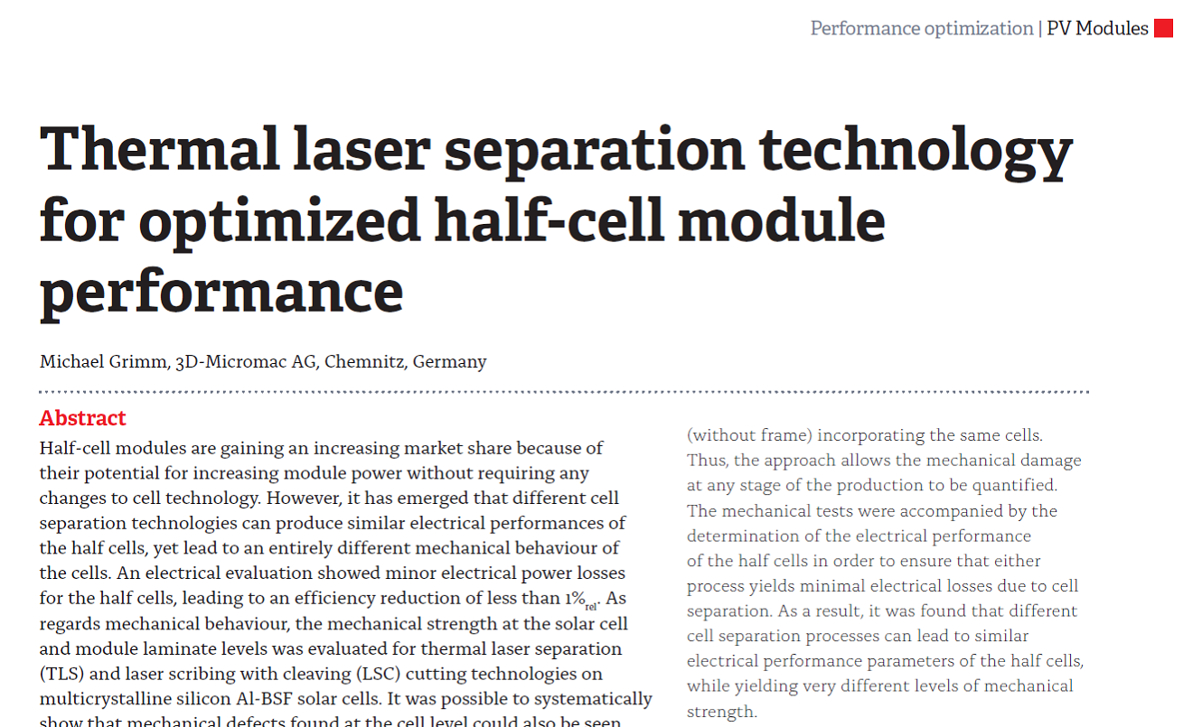 Half-cell modules are gaining an increasing market share because of their potential for increasing module power without requiring any changes to cell technology. However, it has emerged that different cell separation technologies can produce similar electrical performances of the half cells, yet lead to an entirely different mechanical behaviour of the cells.