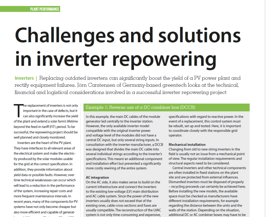 Replacing outdated inverters can significantly boost the yield of a PV power plant and rectify equipment failures. Jörn Carstensen of Germany-based greentech looks at the technical, financial and logistical considerations involved in a successful inverter repowering project.