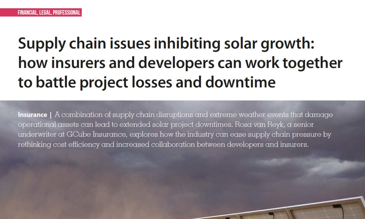 A combination of supply chain disruptions and extreme weather events that damage operational assets can lead to extended solar project downtimes. Rosa van Reyk, a senior underwriter at GCube Insurance, explores how the industry can ease supply chain pressure by rethinking cost efficiency and increased collaboration between developers and insurers.
