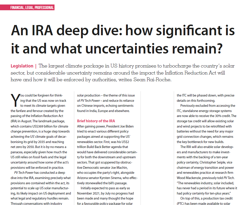 The largest climate package in US history promises to turbocharge the country’s solar sector, but considerable uncertainty remains around the impact the Inflation Reduction Act will have and how it will be enforced by authorities, writes Sean Rai-Roche.