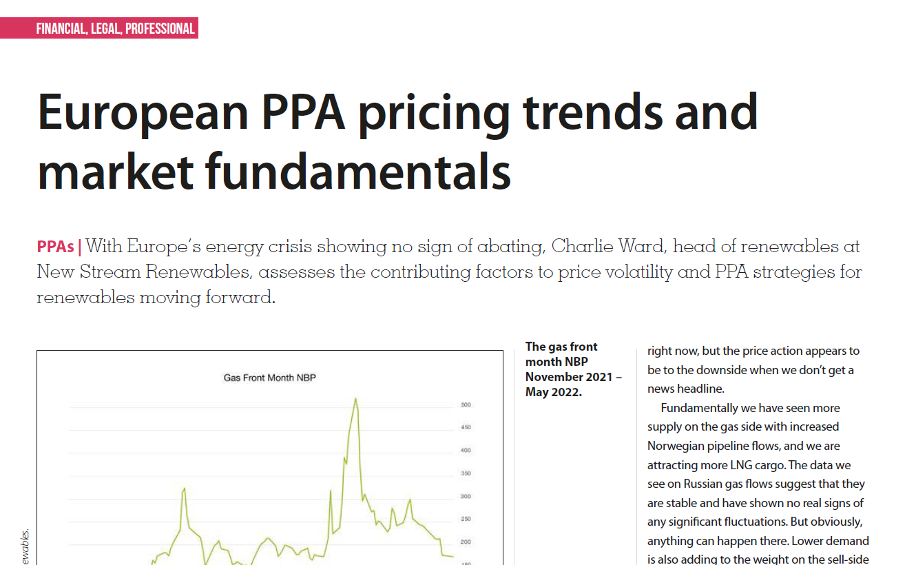 With Europe’s energy crisis showing no sign of abating, Charlie Ward, head of renewables at New Stream Renewables, assesses the contributing factors to price volatility and PPA strategies for renewables moving forward.