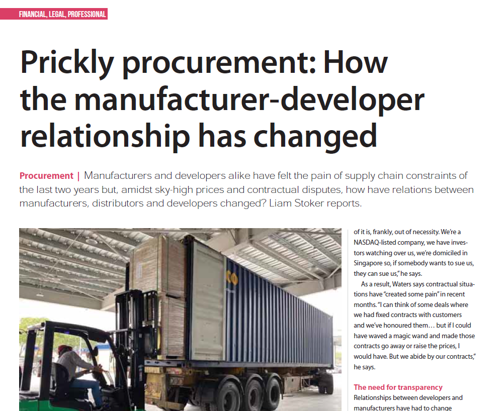 Manufacturers and developers alike have felt the pain of supply chain constraints of the last two years but, amidst sky-high prices and contractual disputes, how have relations between manufacturers, distributors and developers changed? Liam Stoker reports.